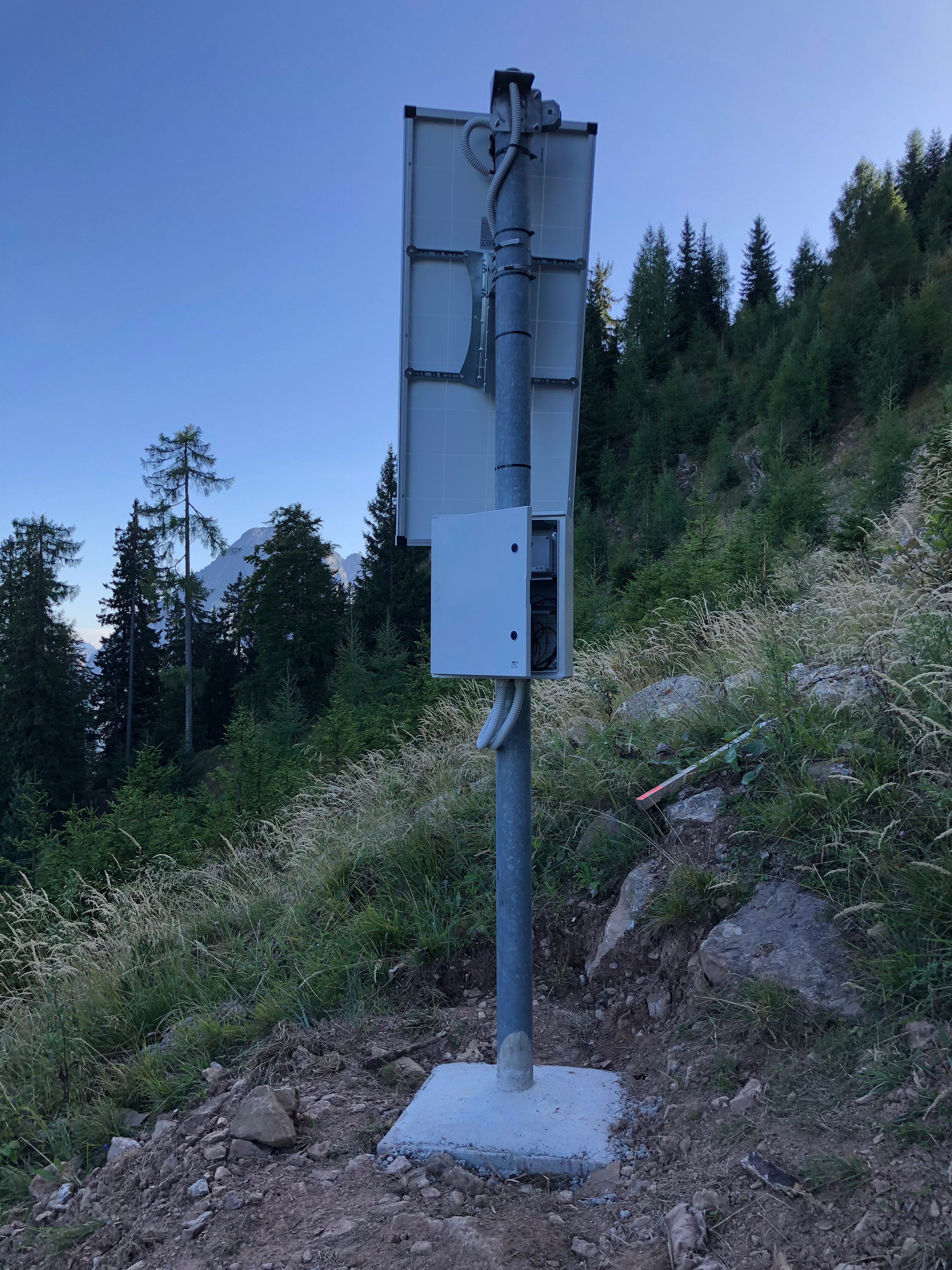 Nel caso di monitoraggio ambientale, vengono posizionati dei manufatti sul corpo di frana o di struttura da monitorare per diverso tempo. I sensori sono alimentati da un pannello solare esterno con un regolatore di carica che garantisce l’alimentazione a 12V in continuo al dispositivo che viene alloggiato all’interno del quadro elettrico. Una serie di tubi corrugati completano la monumentazione sulla quale vengono fatti dei controlli periodici per la verifica del corretto funzionamento.